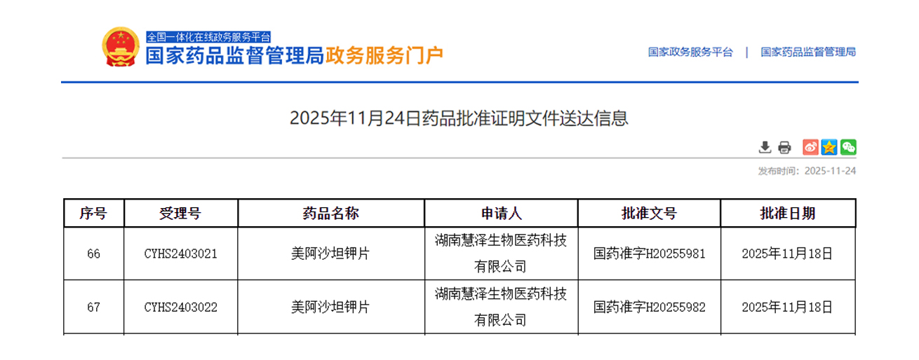 2025年11月24日,国家药品监督管理局(NMPA)官网公布,湖南慧泽生物医药科技有限公司(以下简称“慧泽医药”)持证的“美阿沙坦钾片”获批上市,视同过评,批准文号为国药准字H20255981、国药准字H20255982。该品种由慧泽医药全程完成药学研究、临床CRO服务及注册申报。