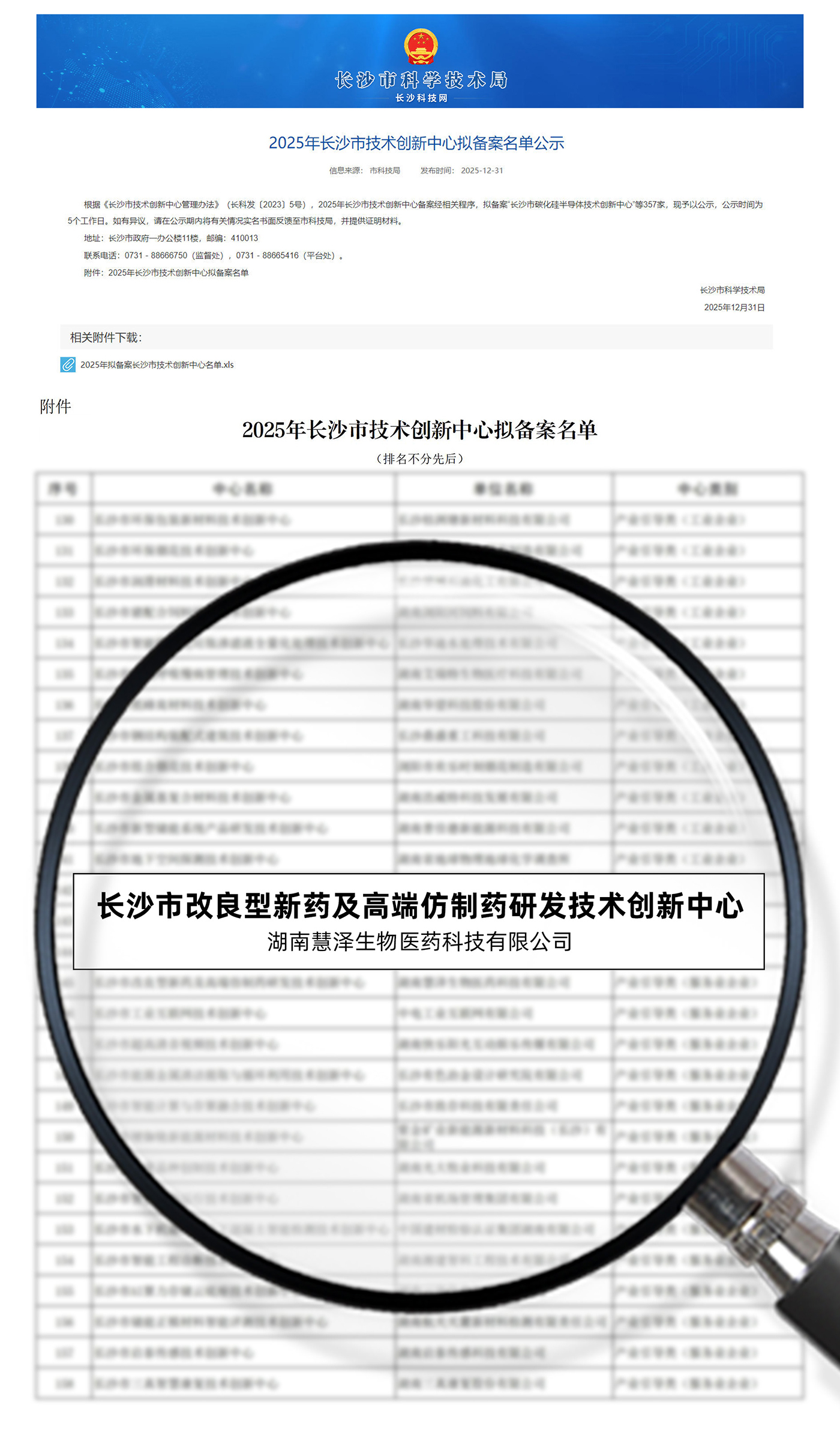 旧章未远,新程在望。2025年12月31日,长沙市科技局公示2025年长沙市技术创新中心备案名单,慧泽医药"改良型新药及高端仿制药研发技术创新中心"成功获批。这不仅标志着我司的改良型新药及高端仿制药研发技术创新平台跻身长沙市重点科技创新平台行列,也标志着我司的改良型新药及高端仿制药研发成果、以及完整的创新研发体系,展现出长沙生物医药企业锐意进取的创新实力。
