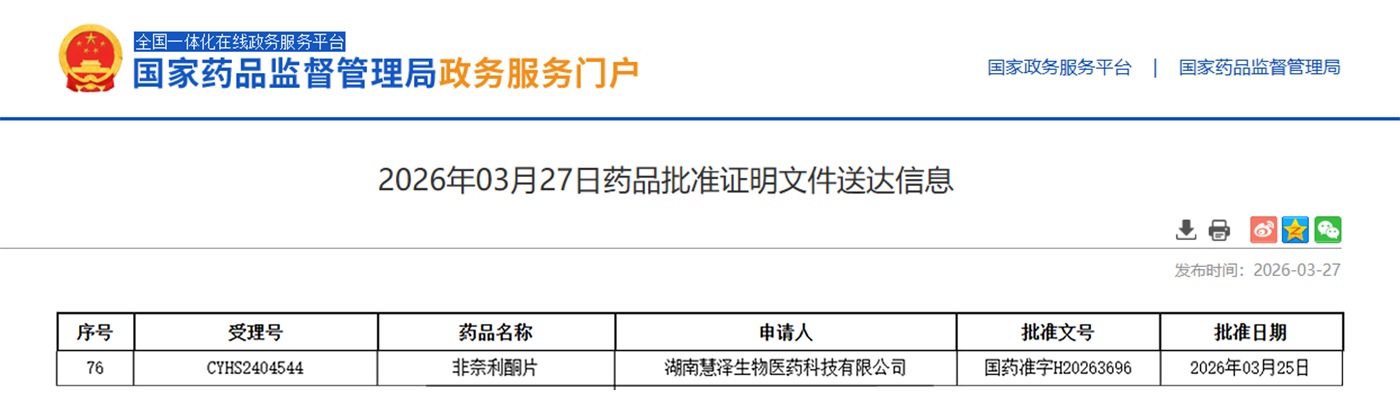 2026年03月27日,国家药品监督管理局(NMPA)官网公布,湖南慧泽生物医药科技有限公司(以下简称“慧泽医药”)持证的非奈利酮片(规格:10mg),全国第二家获批上市,批准文号为国药准字H20263696。